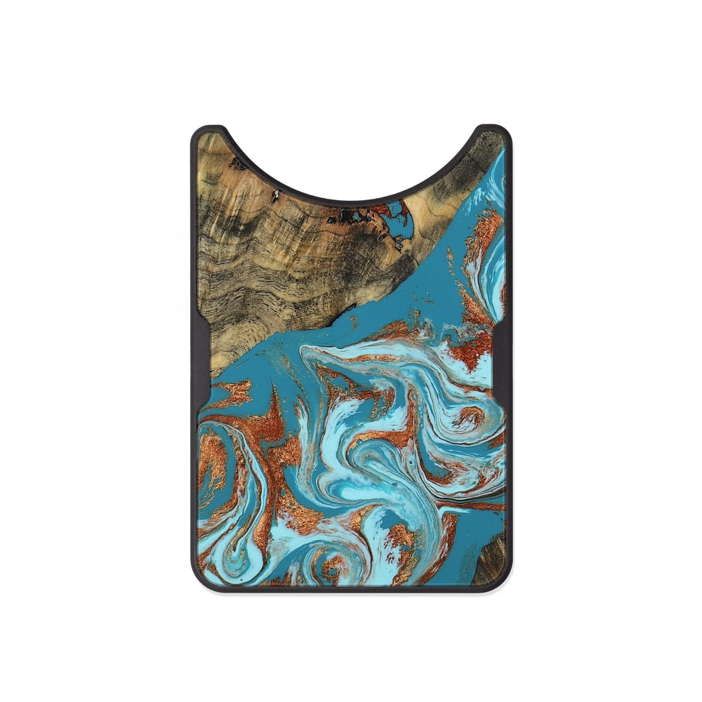 Edythe has beautiful, swirling patterns in shades of blue and copper on a warm, rich wood background. Edythe showcases the natural grain of Buckeye wood, creating a striking and unique piece of art.
