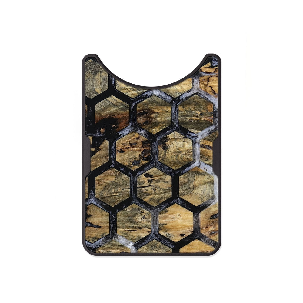 Syble has a striking hexagonal pattern that creates a unique, organized look. Its warm, natural wood tones stand out against a dark background, highlighting the beauty of the wood.