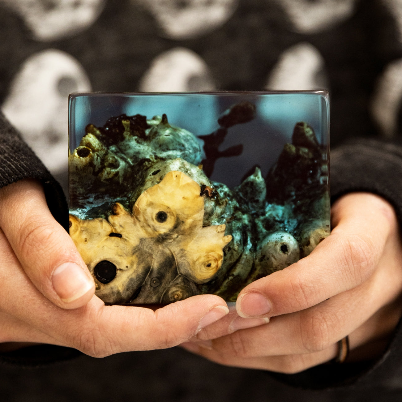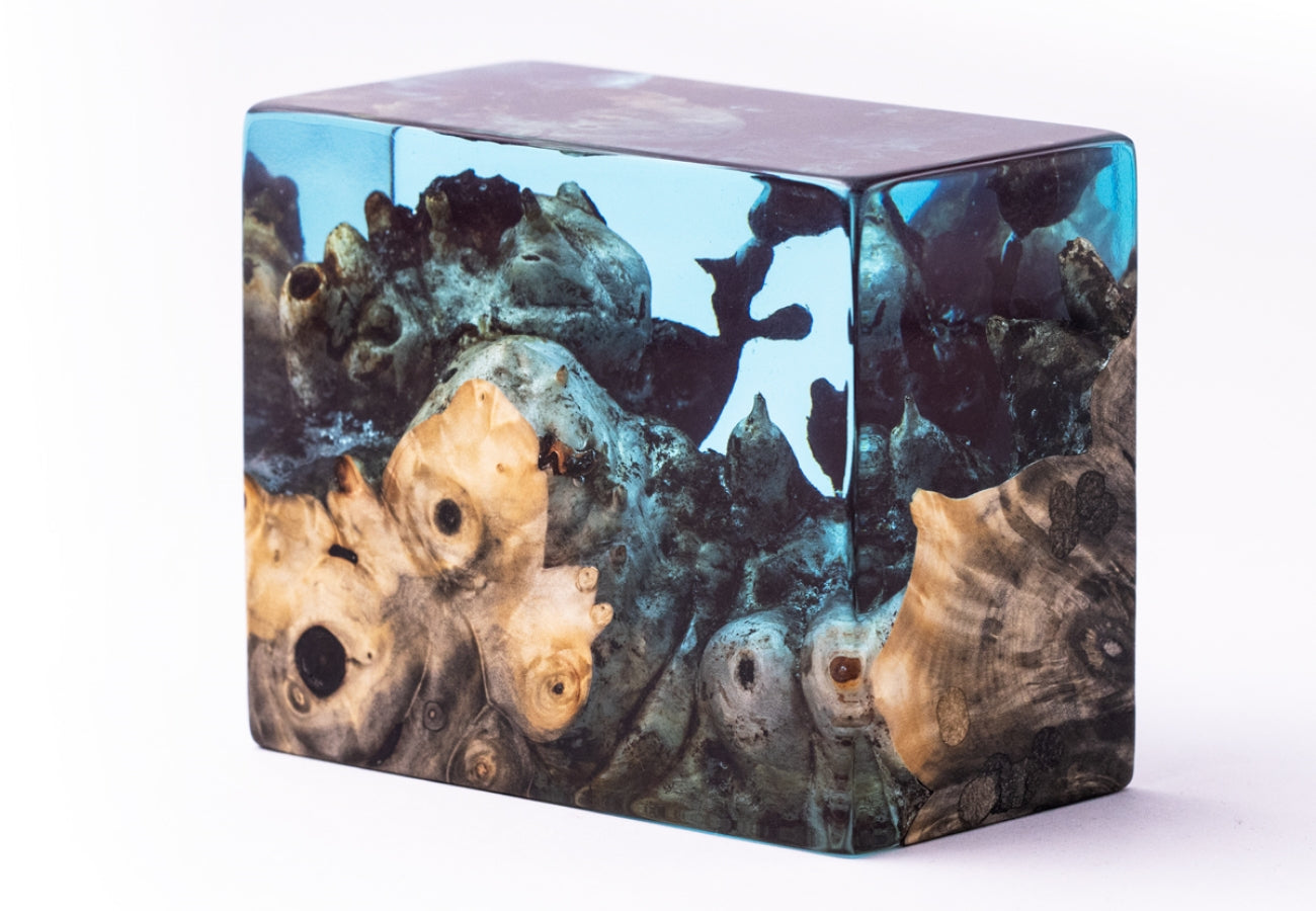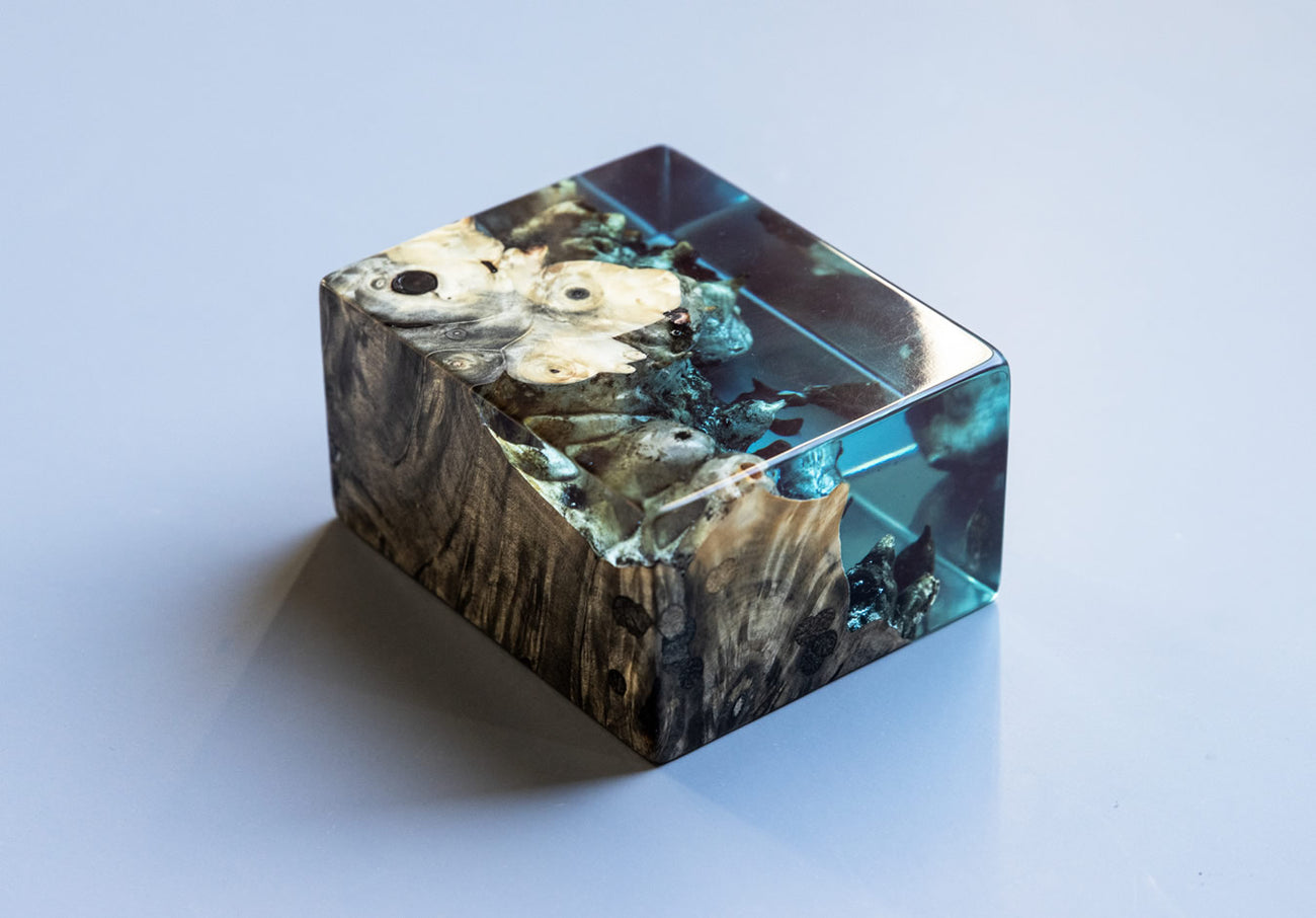 Our Monolith is made from burl wood and resin. We stabilize the wood to help it resist humidity changes, then add resin, dyes and pigments. When the finished part has fully hardened, we cut it to size and polish it to an almost mirror finish.
