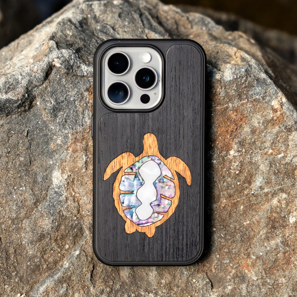 The Sea Turtle inlay was one of our most popular inlays, and it's back for Birthday Week 2024! Each case is laser cut, inlaid and then finished at our shop. The case uses two wood types (Ebony for the base and Mahogany for the turtle body). The turtle shell is made of two different types of genuine Abalone shell.
