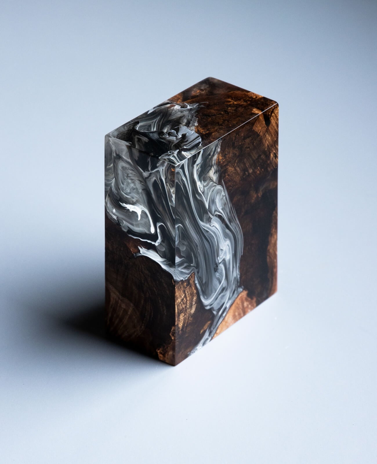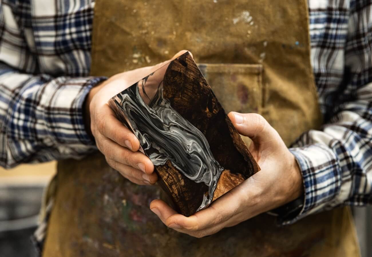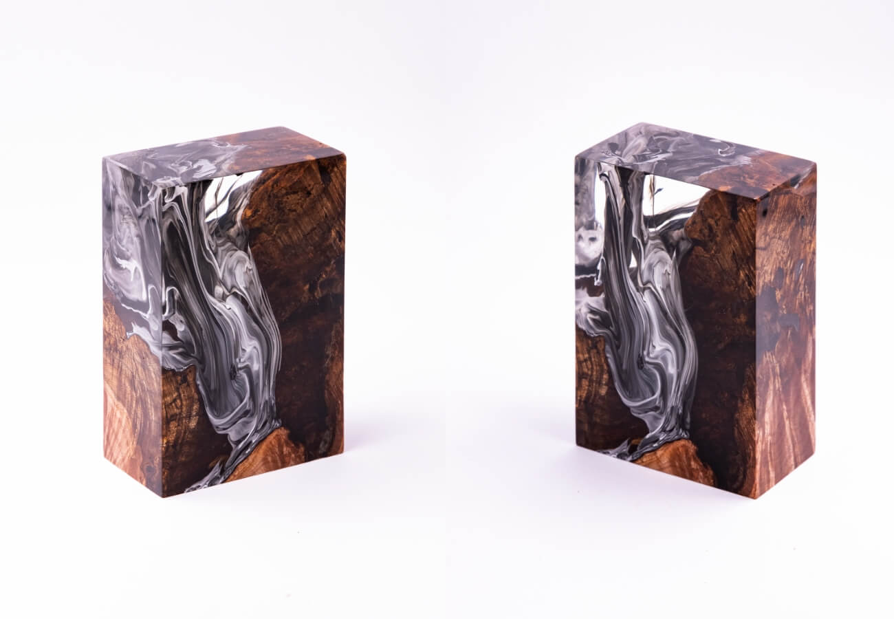 Our Monolith is made from burl wood and resin. We stabilize the wood to help it resist humidity changes, then add resin, dyes and pigments. When the finished part has fully hardened, we cut it to size and polish it to an almost mirror finish.
