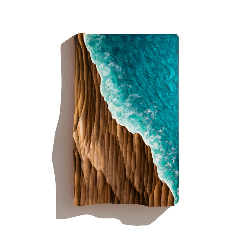 This design reminds us of looking down at a beach from above, where teal waves meet the warm sandy shore. Each piece is truly one-of-a-kind, made just for you.