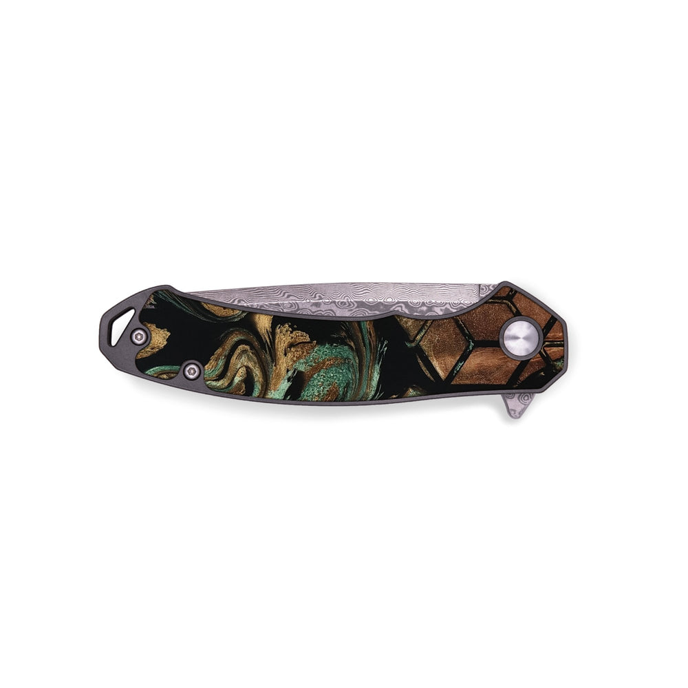 - Materials: Burl Wood, Resin, Damascus Stainless Steel