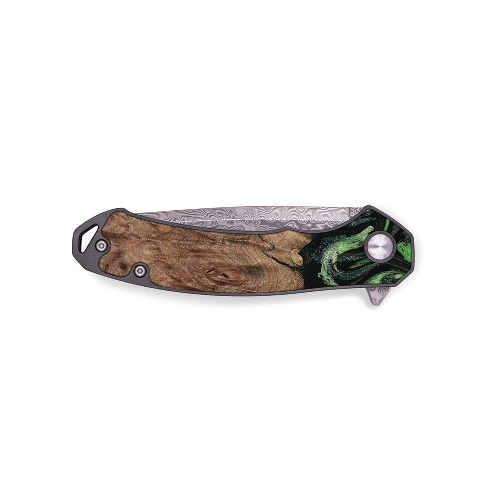 - Materials: Burl Wood, Resin, Damascus Stainless Steel