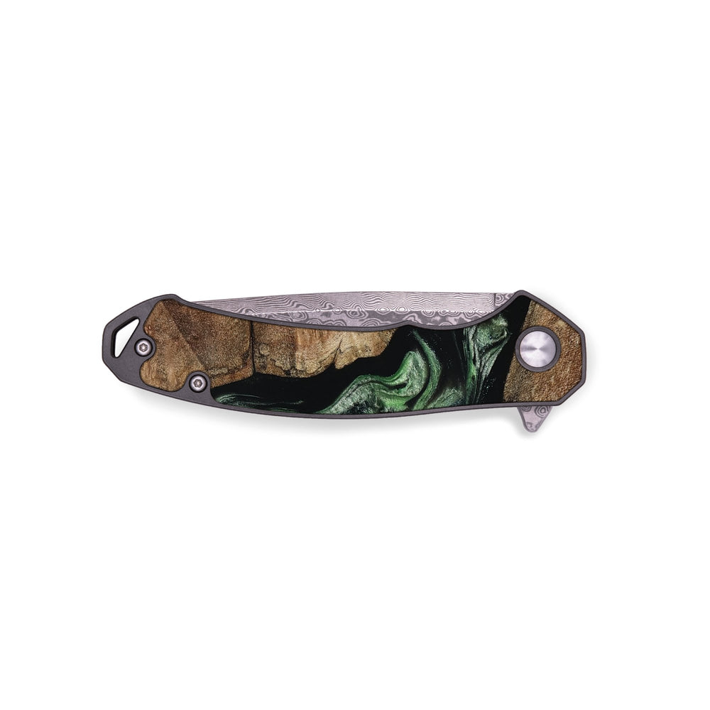 Experience the perfect blend of form and function with our durable folding pocket knife, featuring a lightweight titanium handle. The Damascus stainless steel blade is complemented by a unique wood burl and resin inlay. Imported blade and handle.