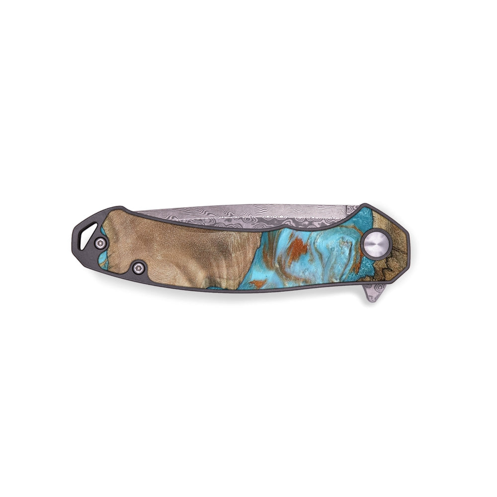 Experience the perfect blend of form and function with our durable folding pocket knife, featuring a lightweight titanium handle. The Damascus stainless steel blade is complemented by a unique wood burl and resin inlay. Imported blade and handle.