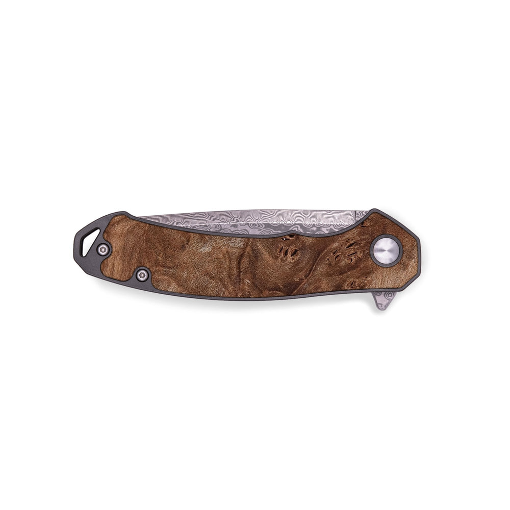 Experience the perfect blend of form and function with our durable folding pocket knife, featuring a lightweight titanium handle. The Damascus stainless steel blade is complemented by a unique wood burl and resin inlay. Imported blade and handle.