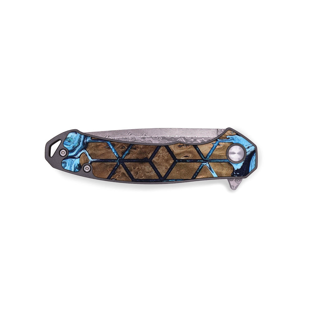 Experience the perfect blend of form and function with our durable folding pocket knife, featuring a lightweight titanium handle. The Damascus stainless steel blade is complemented by a unique wood burl and resin inlay. Imported blade and handle.