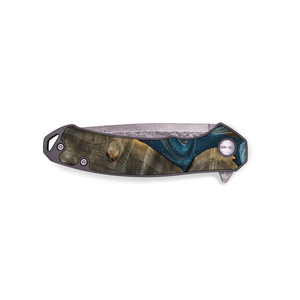 Experience the perfect blend of form and function with our durable folding pocket knife, featuring a lightweight titanium handle. The Damascus stainless steel blade is complemented by a unique wood burl and resin inlay. Imported blade and handle.