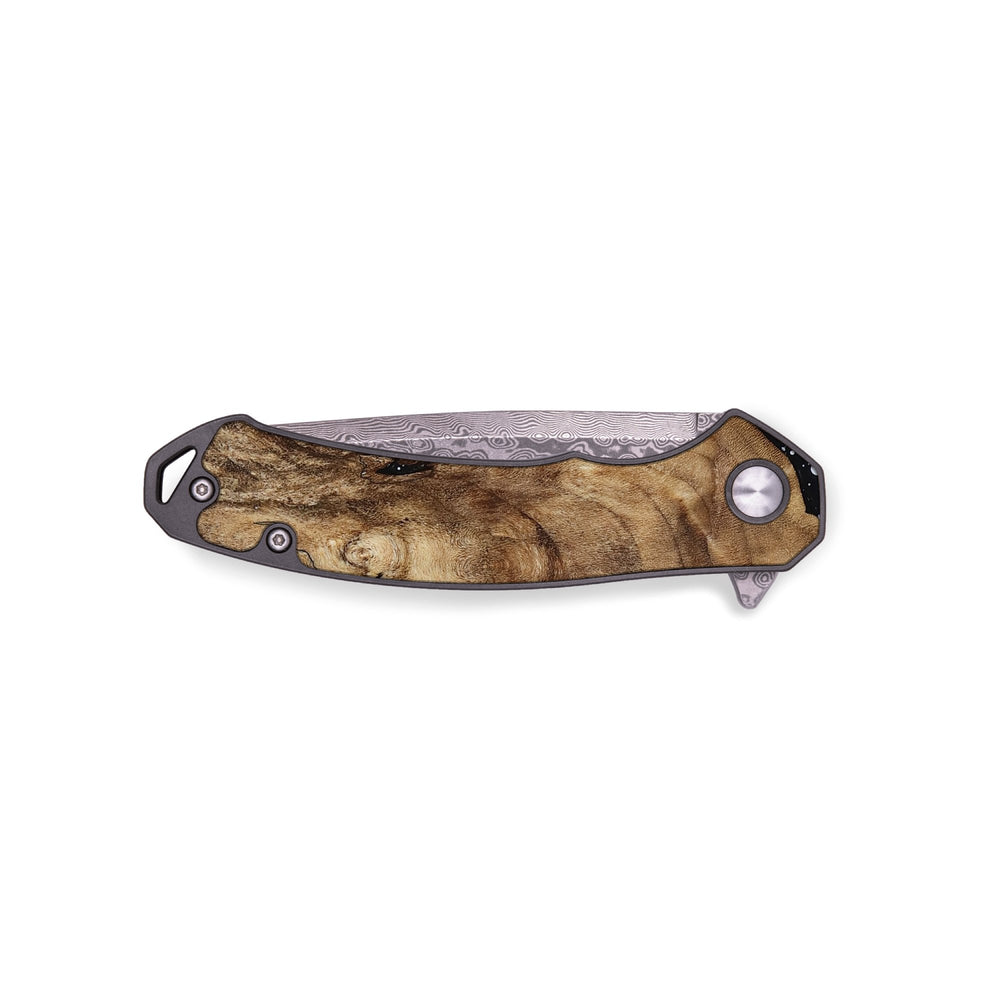 Experience the perfect blend of form and function with our durable folding pocket knife, featuring a lightweight titanium handle. The Damascus stainless steel blade is complemented by a unique wood burl and resin inlay. Imported blade and handle.