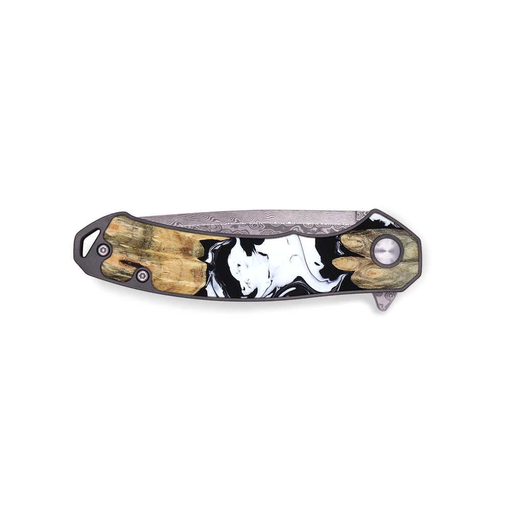 Experience the perfect blend of form and function with our durable folding pocket knife, featuring a lightweight titanium handle. The Damascus stainless steel blade is complemented by a unique wood burl and resin inlay. Imported blade and handle.