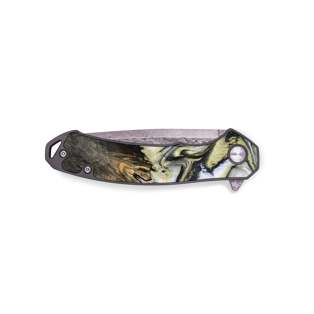 Experience the perfect blend of form and function with our durable folding pocket knife, featuring a lightweight titanium handle. The Damascus stainless steel blade is complemented by a unique wood burl and resin inlay. Imported blade and handle.