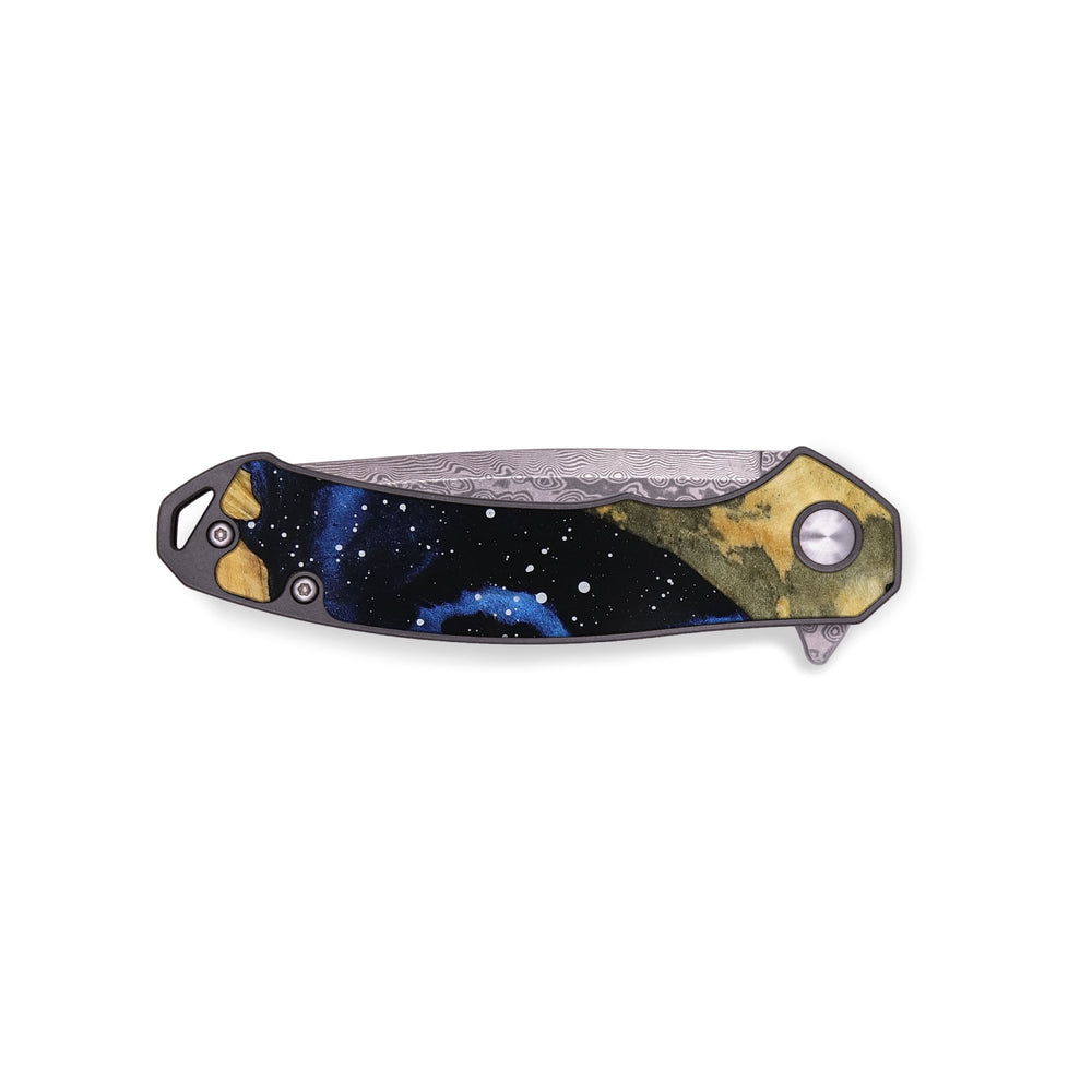Experience the perfect blend of form and function with our durable folding pocket knife, featuring a lightweight titanium handle. The Damascus stainless steel blade is complemented by a unique wood burl and resin inlay. Imported blade and handle.