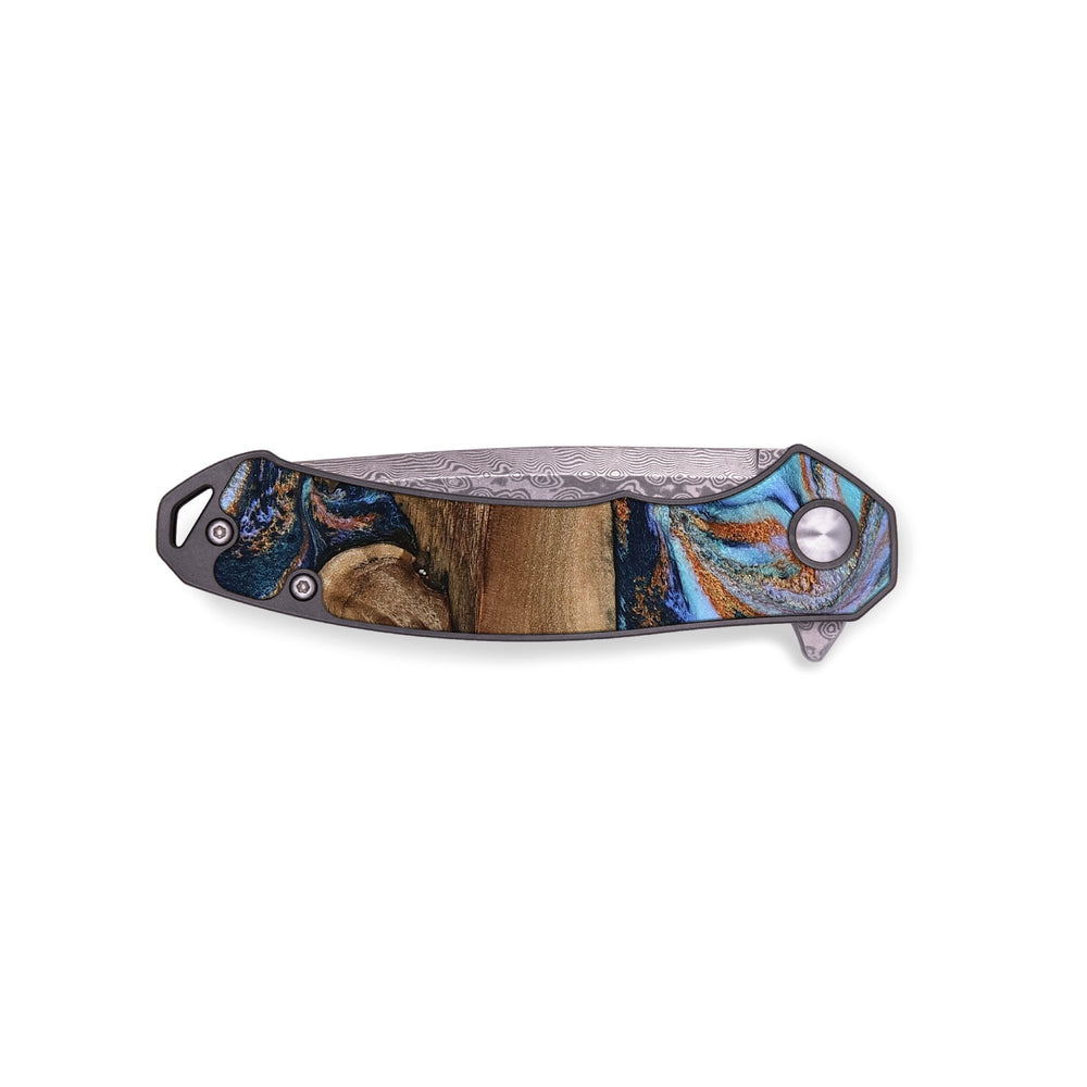 Experience the perfect blend of form and function with our durable folding pocket knife, featuring a lightweight titanium handle. The Damascus stainless steel blade is complemented by a unique wood burl and resin inlay. Imported blade and handle.