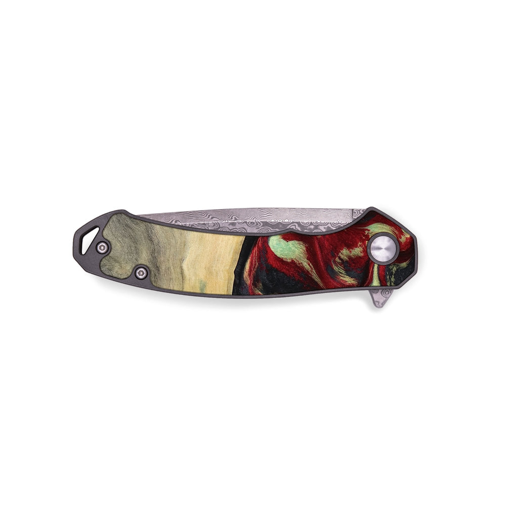 Experience the perfect blend of form and function with our durable folding pocket knife, featuring a lightweight titanium handle. The Damascus stainless steel blade is complemented by a unique wood burl and resin inlay. Imported blade and handle.