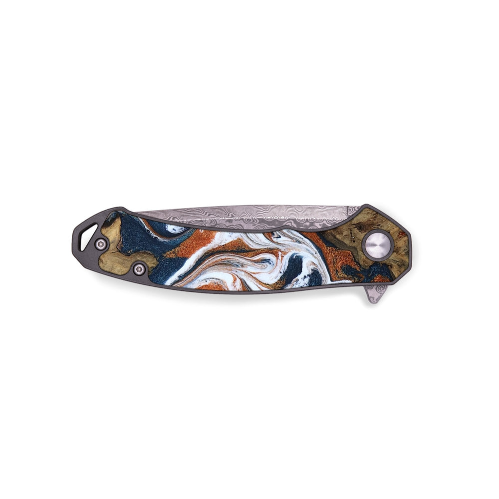 Experience the perfect blend of form and function with our durable folding pocket knife, featuring a lightweight titanium handle. The Damascus stainless steel blade is complemented by a unique wood burl and resin inlay. Imported blade and handle.