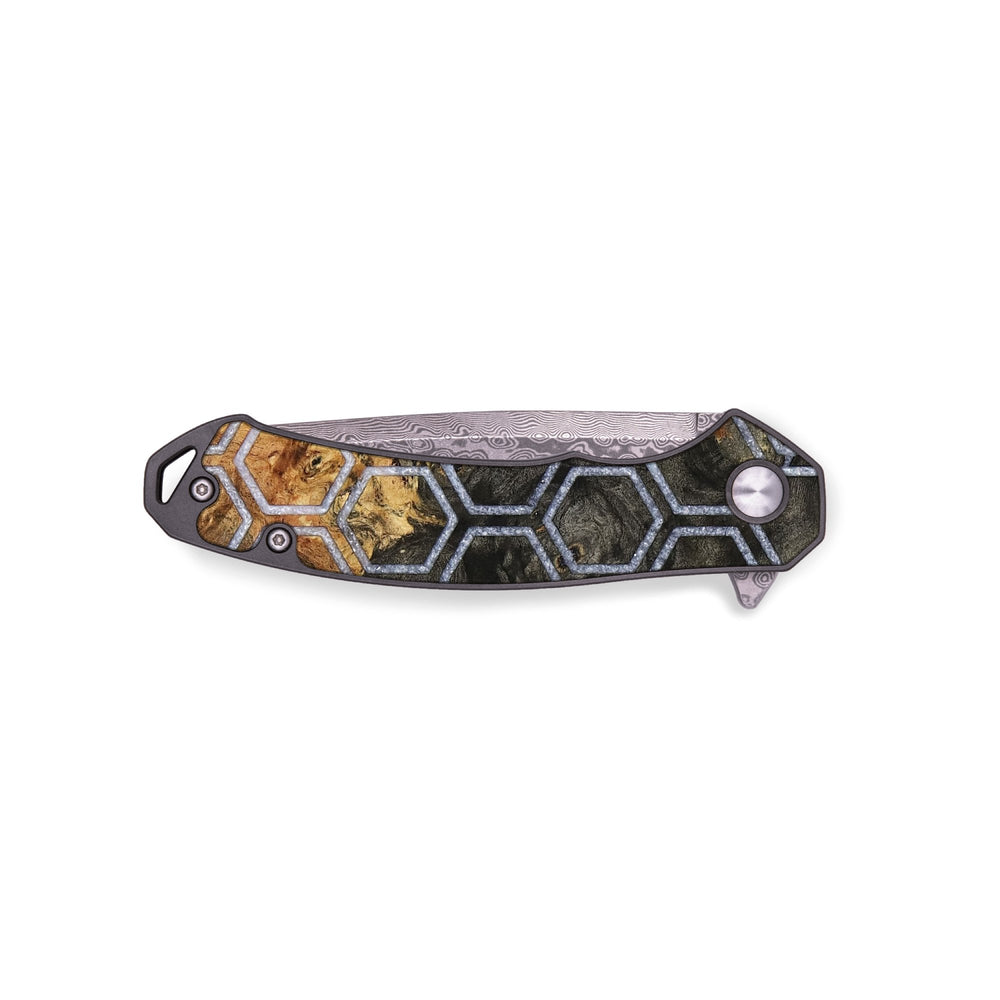 Experience the perfect blend of form and function with our durable folding pocket knife, featuring a lightweight titanium handle. The Damascus stainless steel blade is complemented by a unique wood burl and resin inlay. Imported blade and handle.