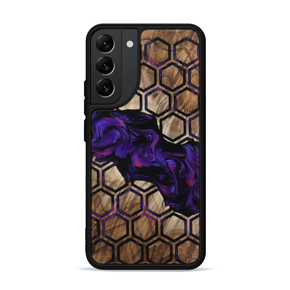 Ashtyn has a beautiful mix of warm maple wood tones and vivid purple swirls. Its hexagonal pattern adds a modern touch to the natural wood background.