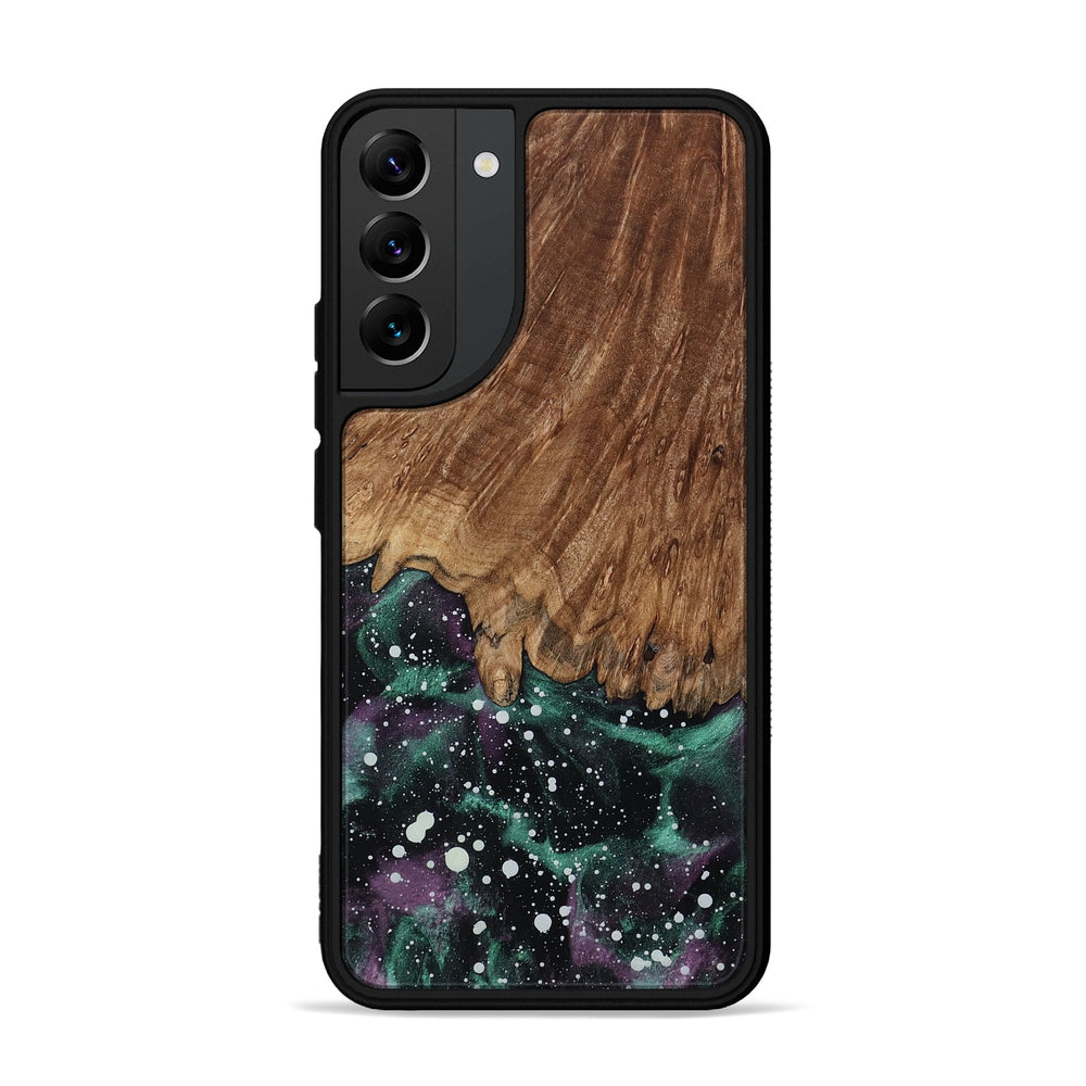 Jakob has rich, warm tones that highlight its natural grain. The smooth surface flows into a cosmic backdrop of dark greens, purples, and white dots.