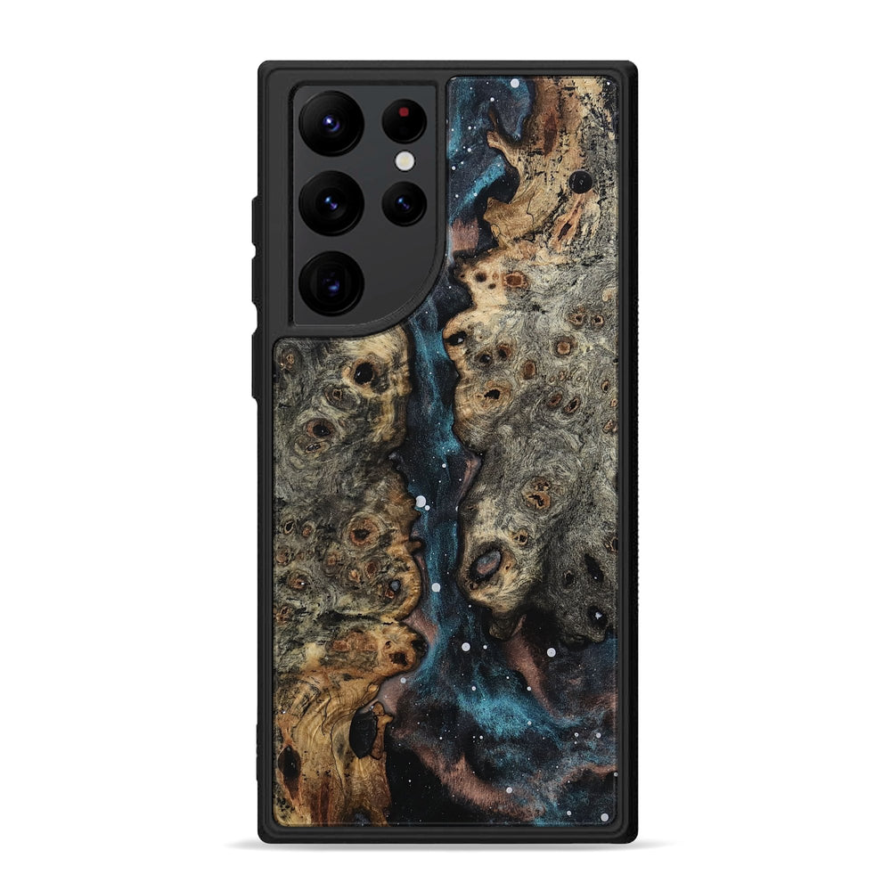 Ardith has a beautiful mix of dark and light wood, with unique patterns that resemble swirling galaxies. Its surface features striking blue accents and small, rounded shapes that create a captivating visual depth.