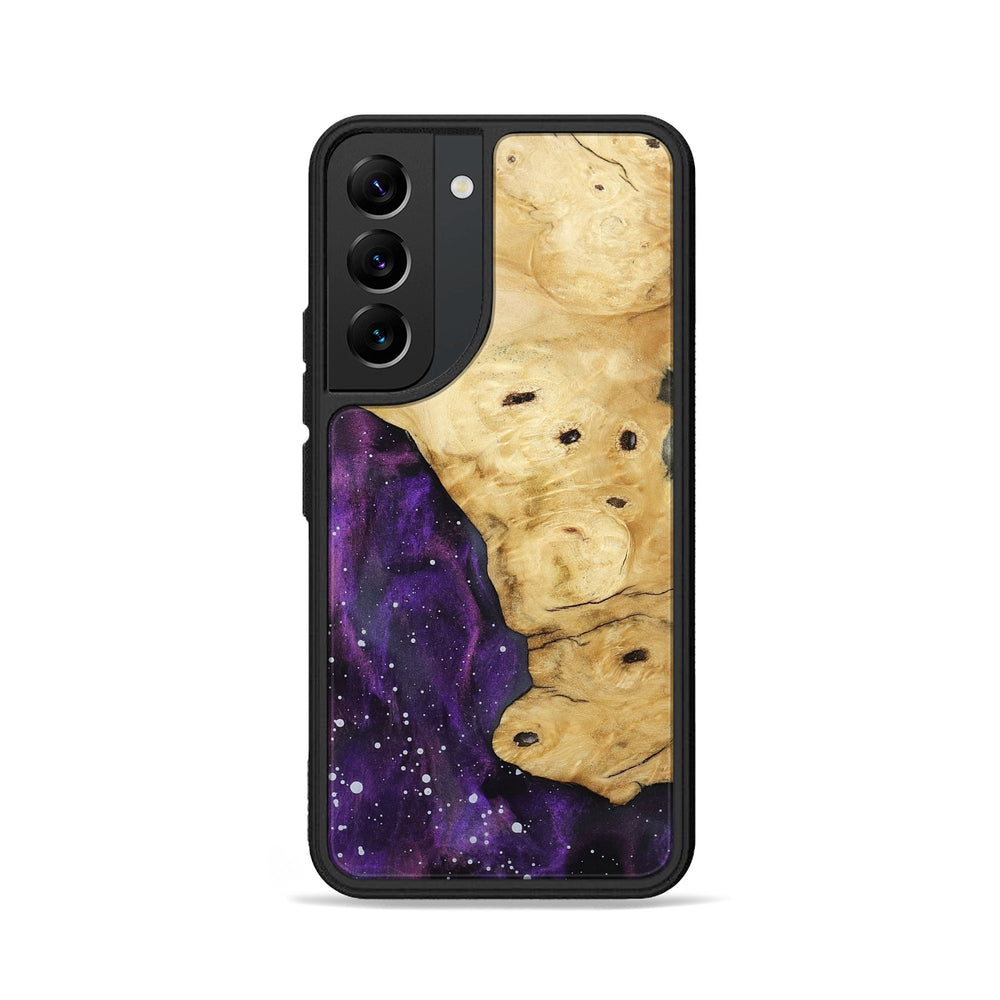 Alison has warm, light brown tones with unique dark spots scattered throughout. The flowing purple background creates a striking contrast, adding depth to the wood's natural beauty.