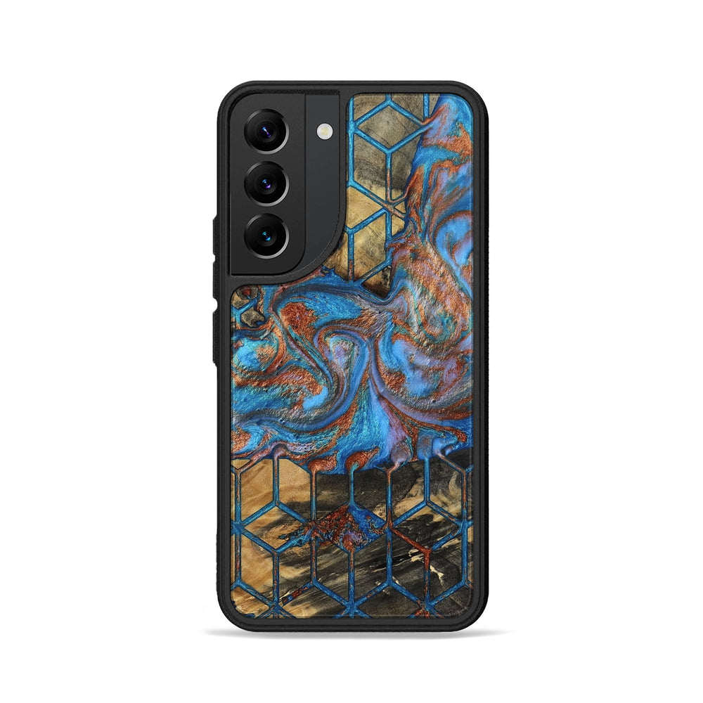 Jarred has beautiful swirls of blue and copper colors dancing across a background of warm wood. The hexagonal pattern adds a unique touch, highlighting the vibrant designs.