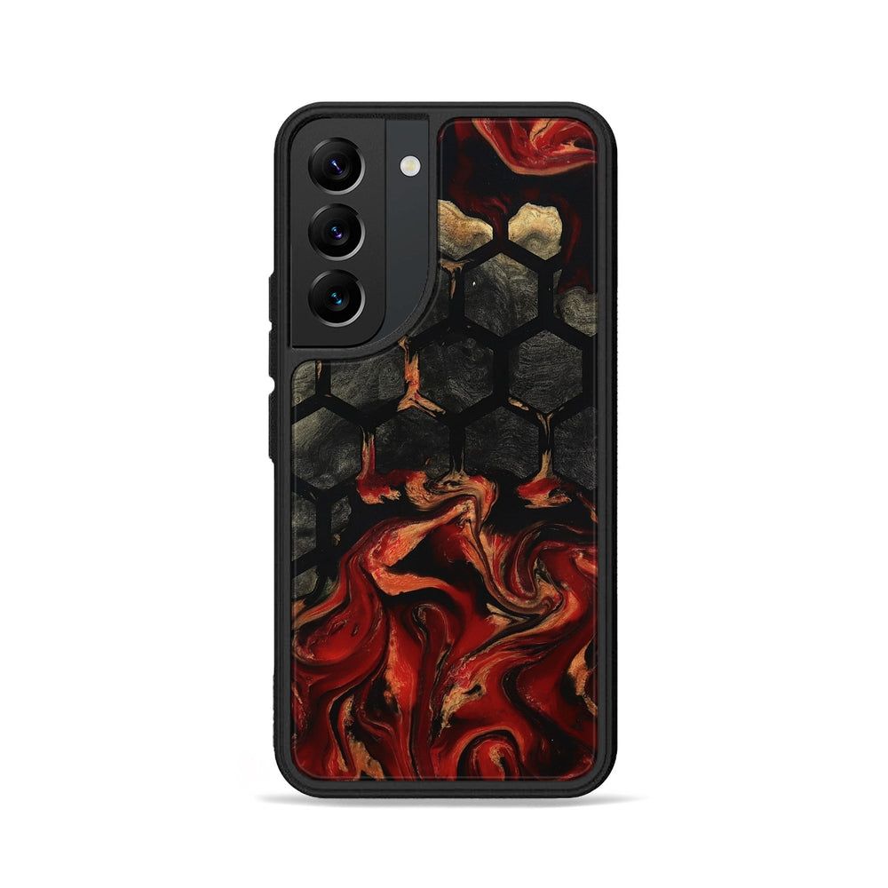 Kirsten has a striking blend of bold red and black swirls that create a dynamic, flowing look. It features a unique hexagonal pattern that adds a touch of structure to the vibrant design.