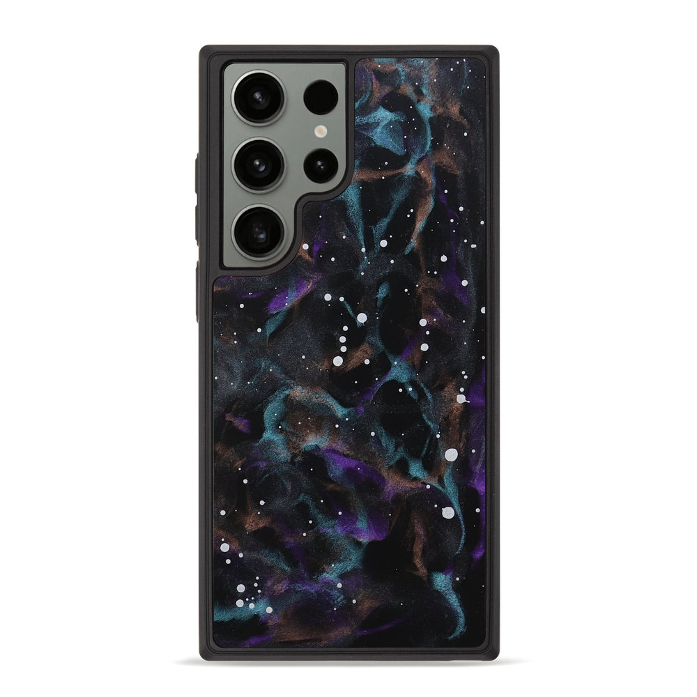 Aric has a deep black background with swirling shades of blue, purple, and hints of bronze. It features white speckles scattered throughout, resembling stars in a night sky.