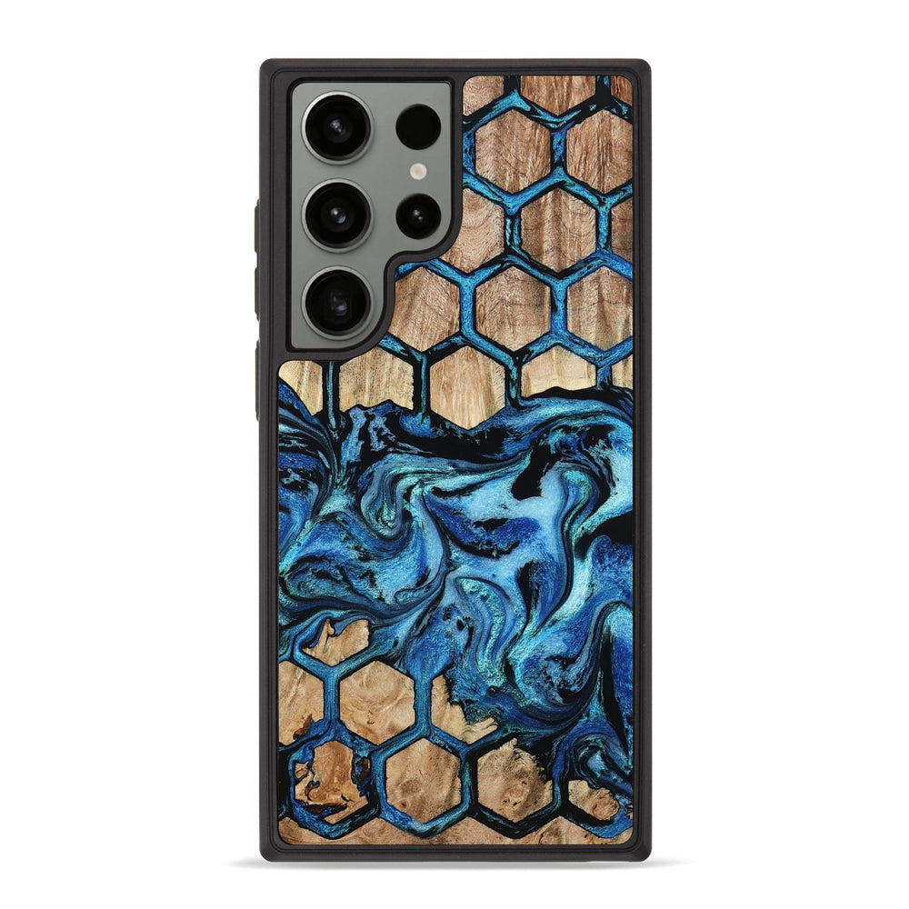 Camille has a warm, natural beauty with honey-colored Maple wood. It features a striking pattern of hexagons, complemented by swirling shades of blue and black.