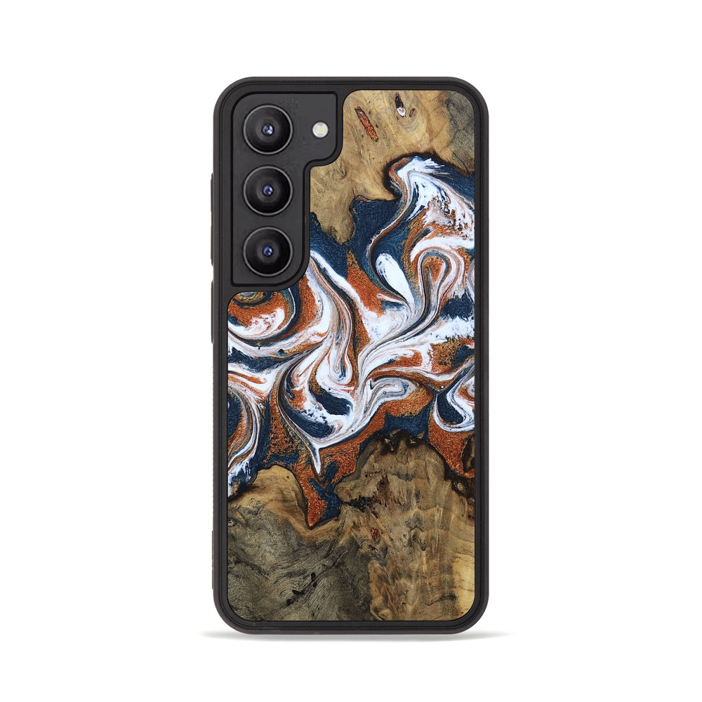 Xzavier has a unique mix of warm browns and striking swirls of white, orange, and blue. The flowing patterns create a beautiful contrast against the natural wood grain.