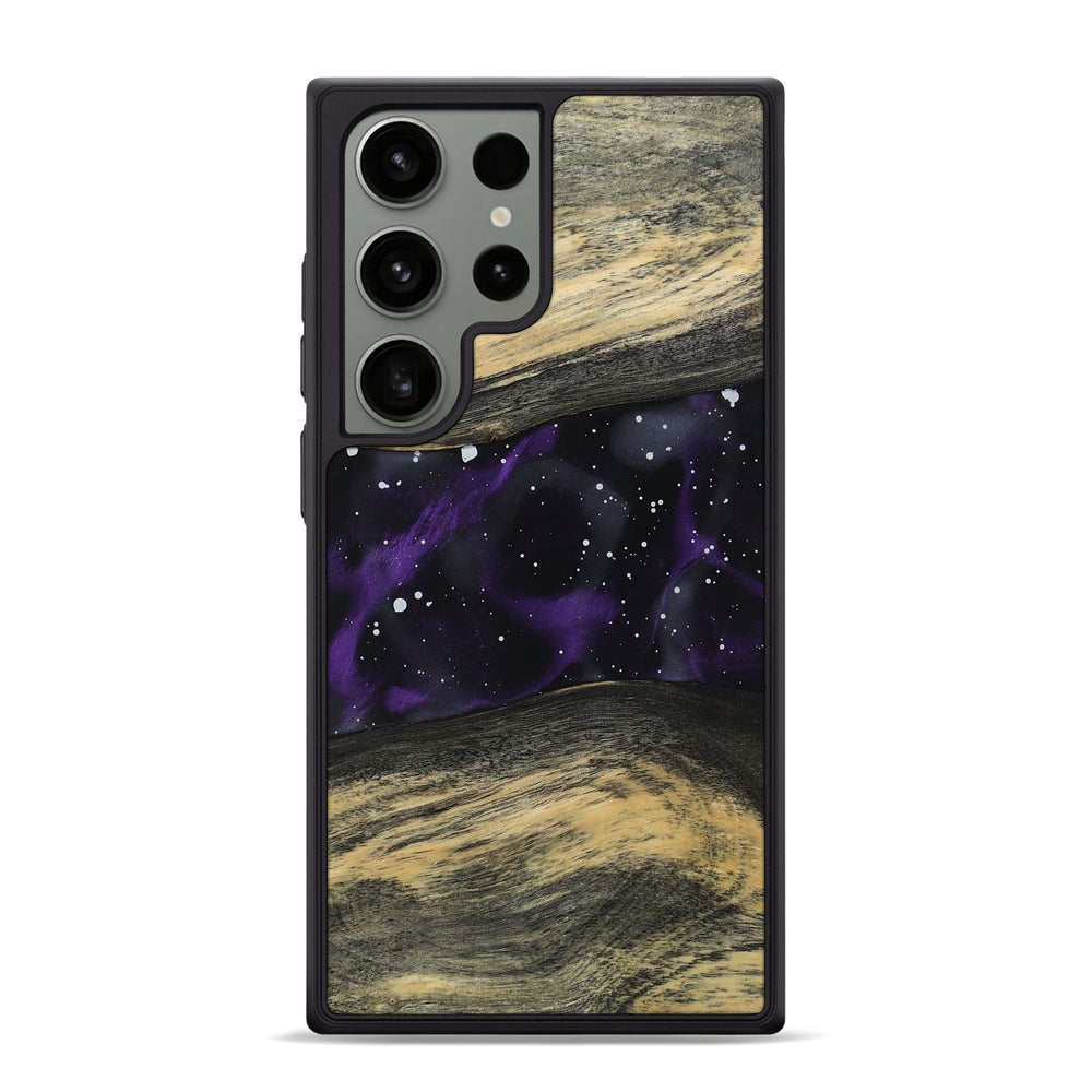 Brielle has beautiful Buckeye wood with gentle waves and a rich, dark grain. It features a striking design that resembles a cosmic scene with purple and white hues.
