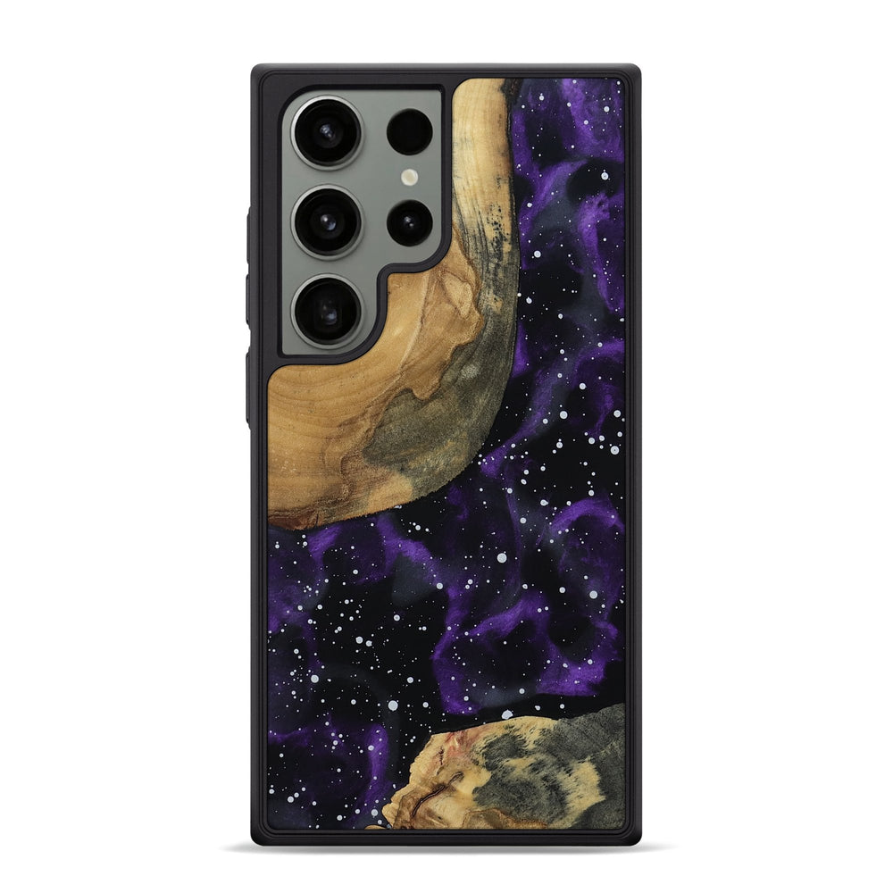 Zahra has beautiful, natural patterns in the rich Buckeye wood, showcasing its smooth texture. The blend of earthy tones and a deep purple background creates a warm yet cosmic feel.