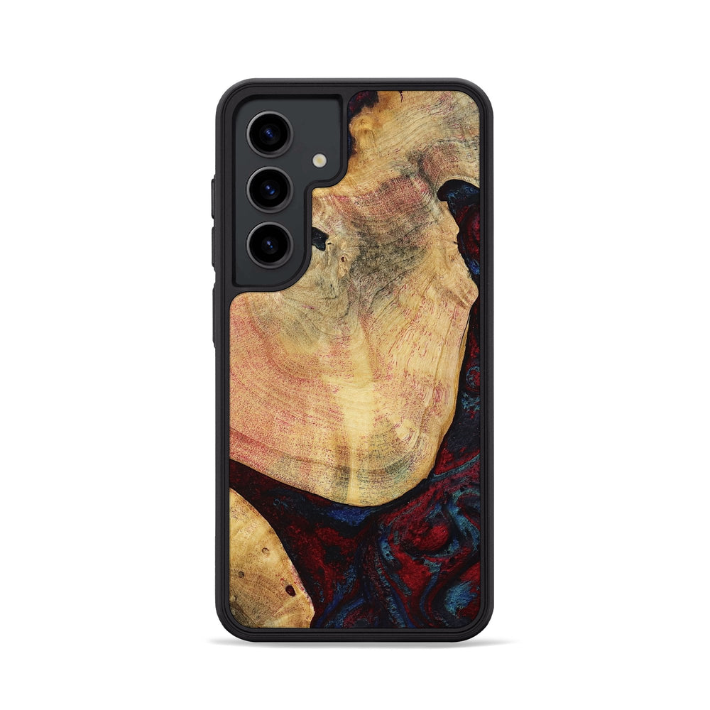 Charley has a warm, golden wood grain with smooth curves and natural patterns. Deep reds and dark blues create a striking contrast, adding a unique touch to its appearance.