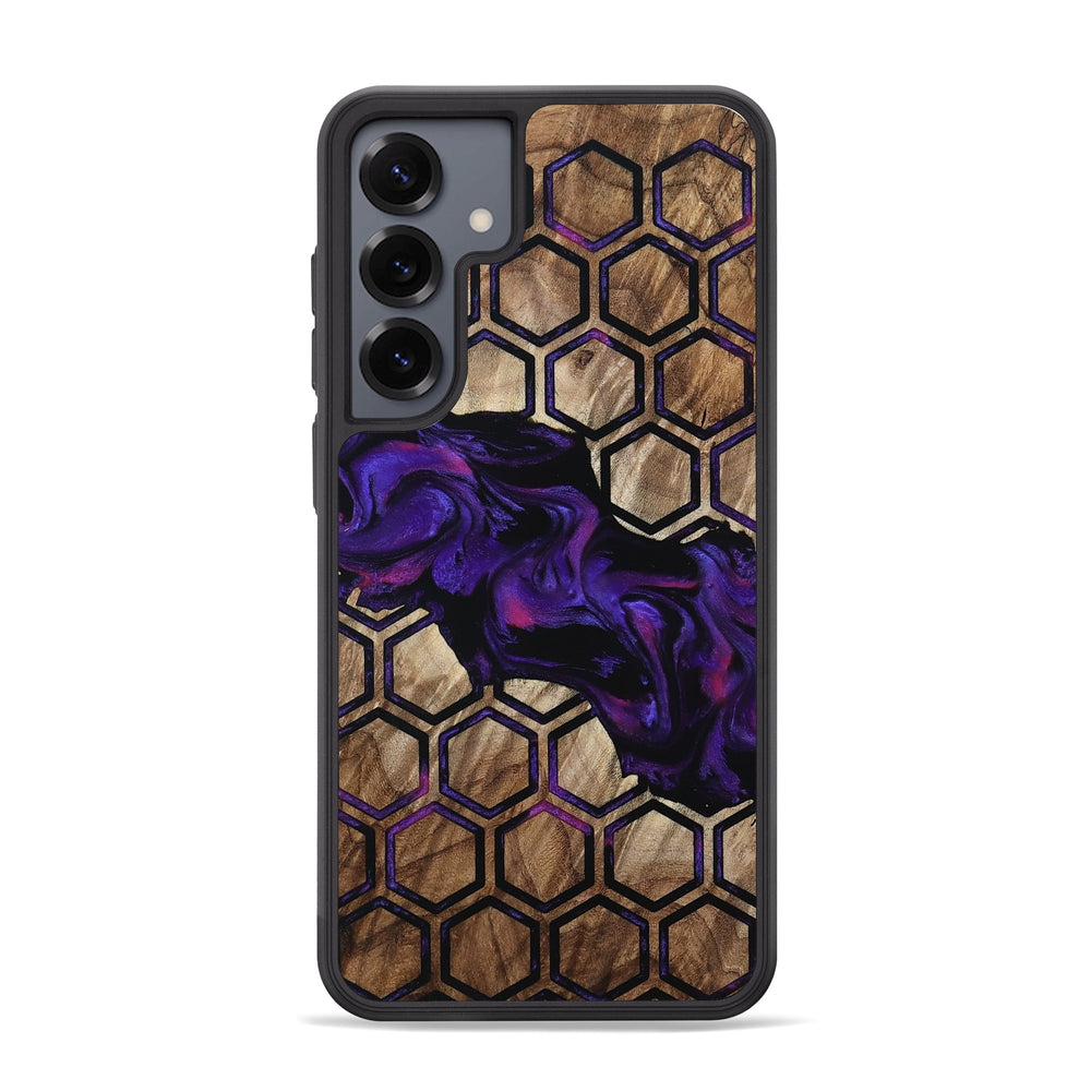 Ashtyn has a beautiful mix of warm maple wood tones and vivid purple swirls. Its hexagonal pattern adds a modern touch to the natural wood background.