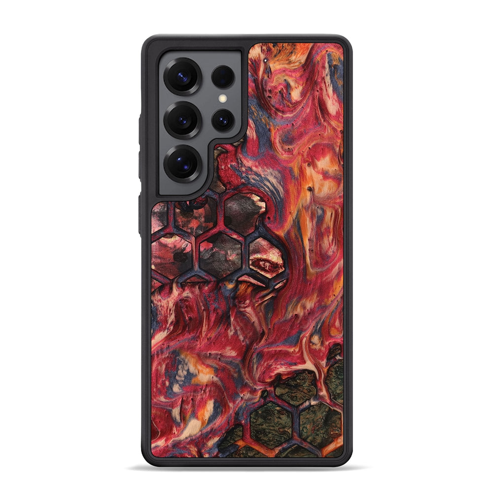 Kobe has vibrant, swirling colors of red, orange, and blue that create a lively feel. The piece features a honeycomb pattern, adding a unique texture to the beautiful dyed wood.