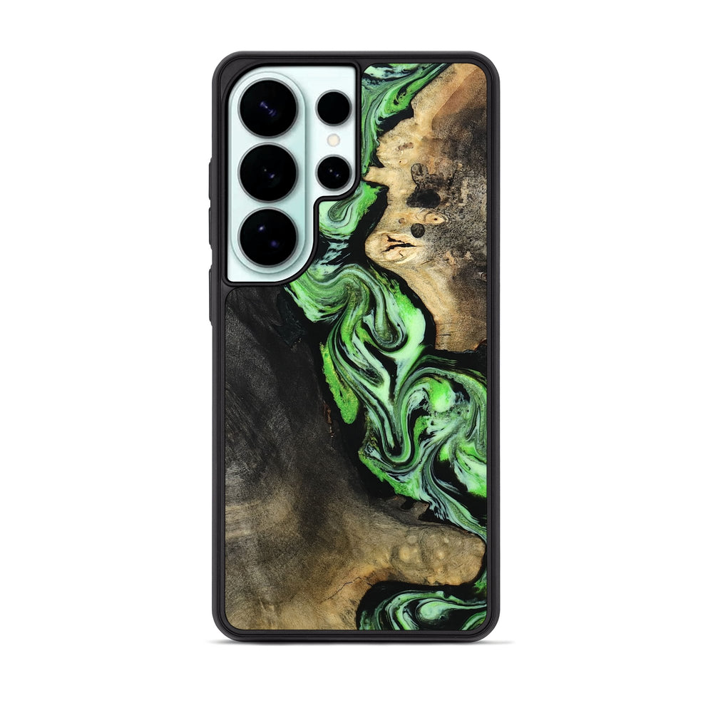 Aiden has a striking mix of dark wood tones and bright green swirls. The pattern flows across the surface, creating a dynamic and lively feel.