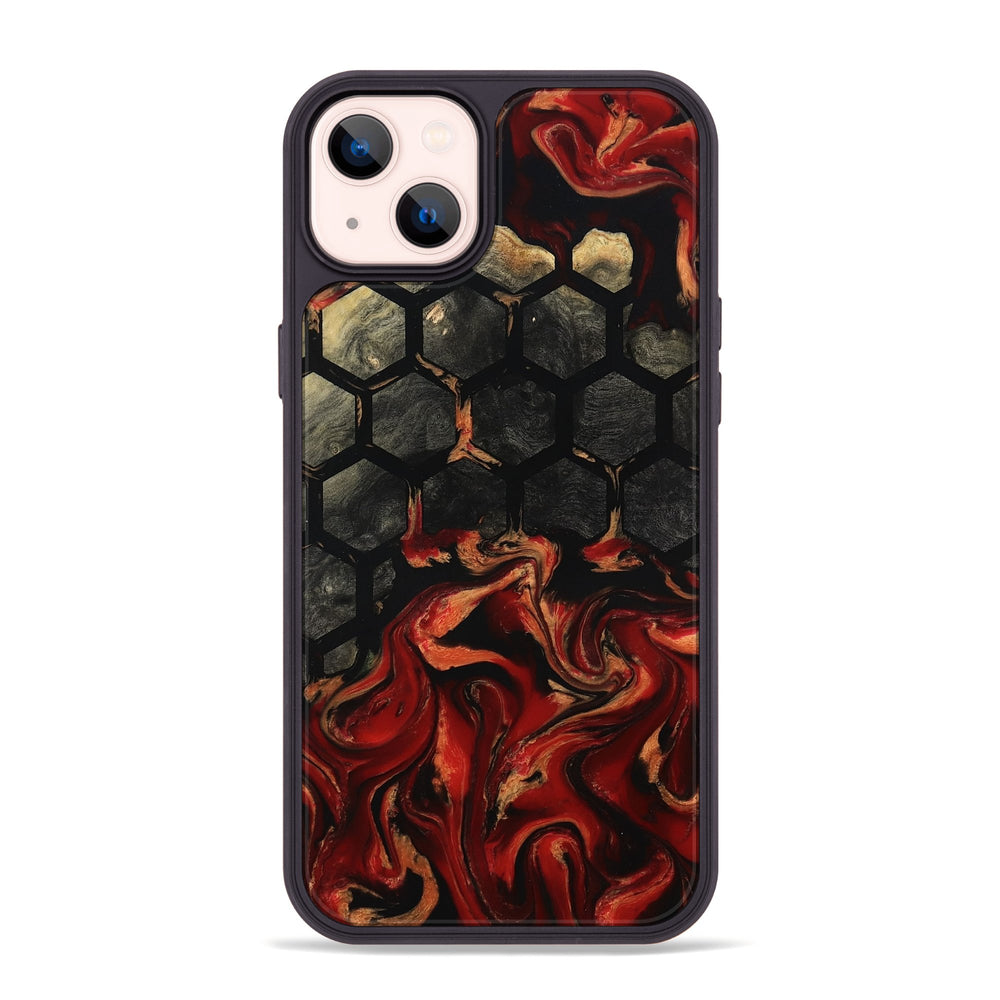 Kirsten has a striking blend of bold red and black swirls that create a dynamic, flowing look. It features a unique hexagonal pattern that adds a touch of structure to the vibrant design.