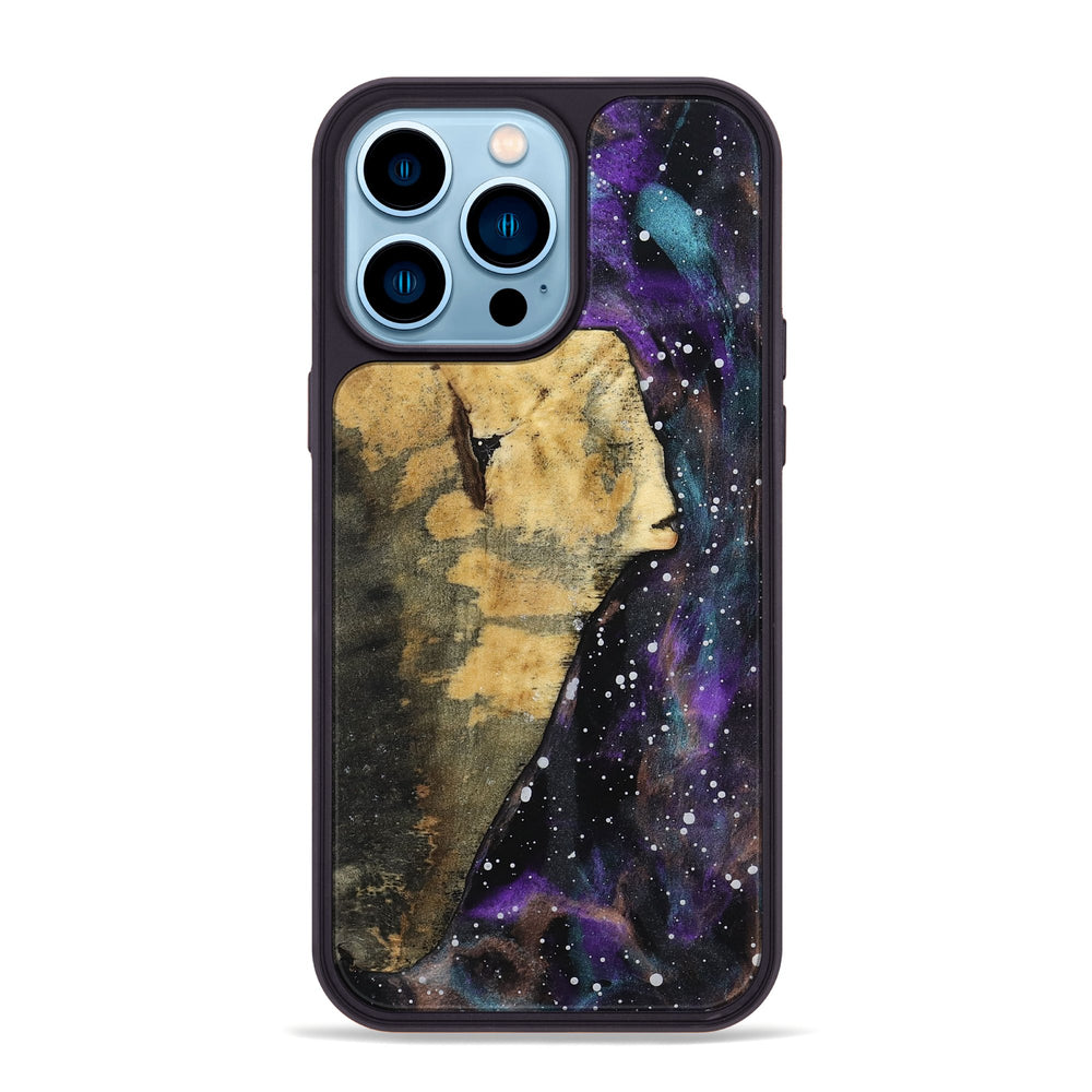 Callen has beautiful patterns that resemble swirling galaxies with deep purples and hints of blue. Its surface features natural wood grain that adds warmth and character, creating a striking contrast with the cosmic colors.