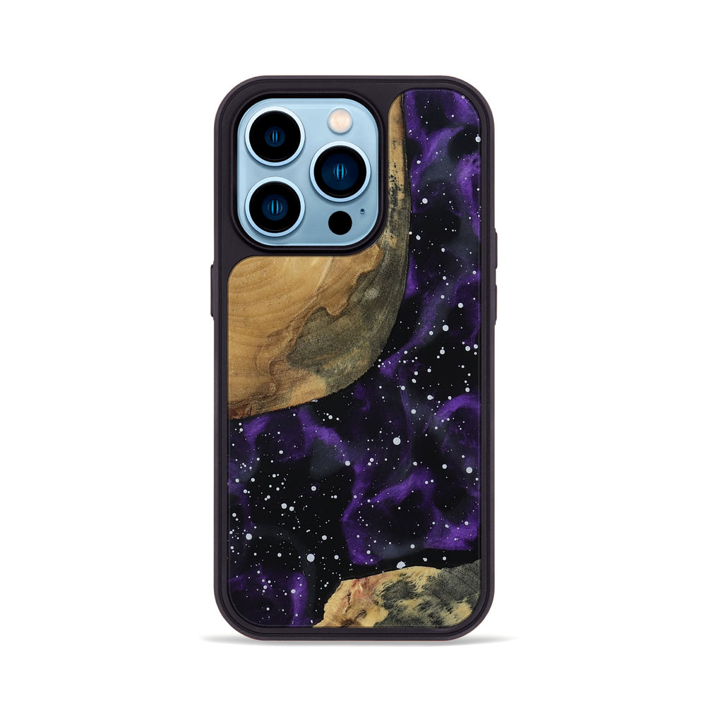 Zahra has beautiful, natural patterns in the rich Buckeye wood, showcasing its smooth texture. The blend of earthy tones and a deep purple background creates a warm yet cosmic feel.