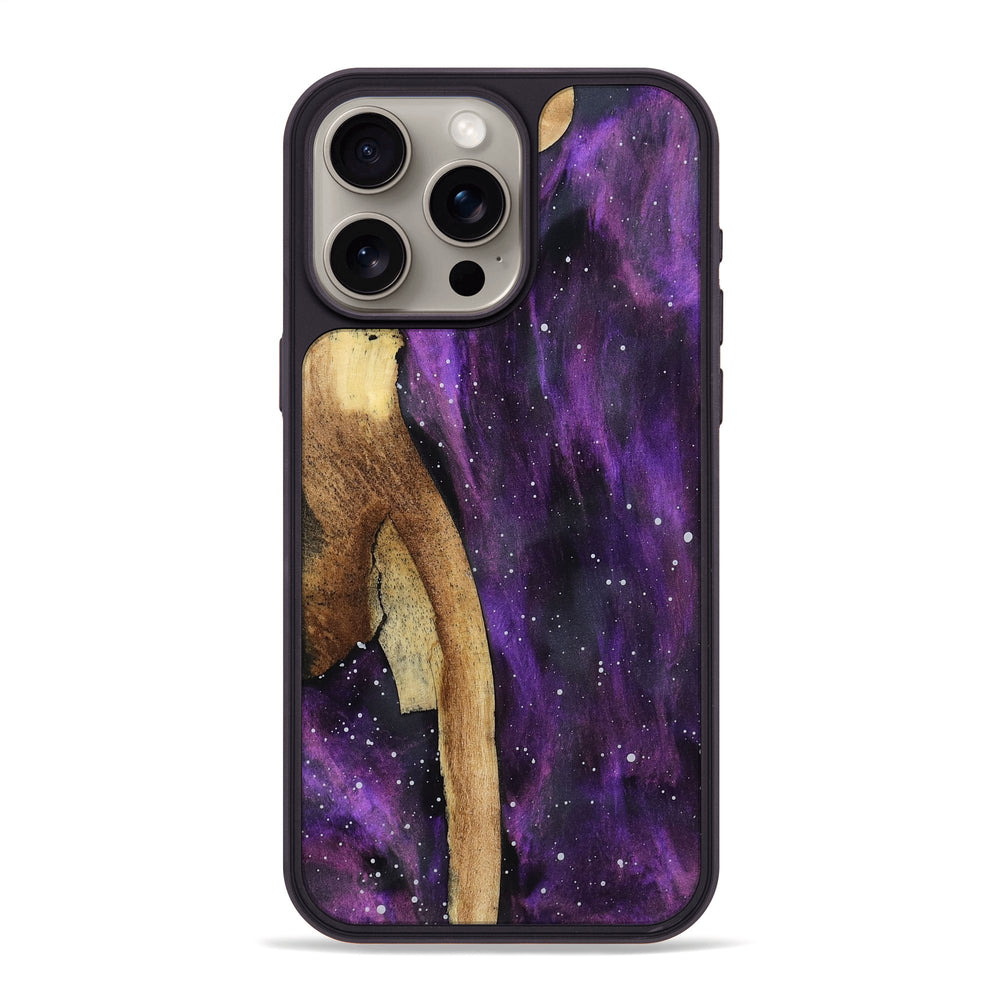 Annie is a beautiful piece of Buckeye wood featuring smooth, flowing lines and a light, natural finish. It showcases a striking blend of purples and blacks, resembling a cosmic scene with hints of star-like speckles throughout.