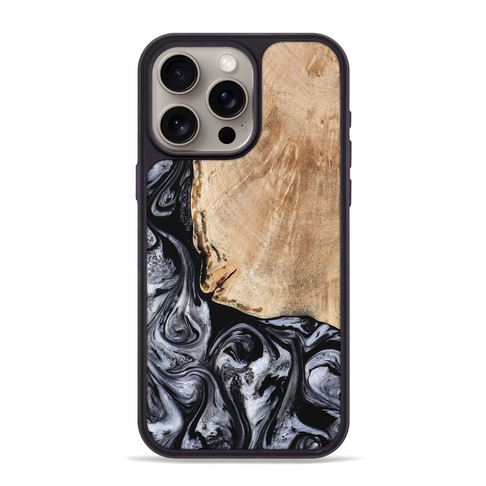 Lola has smooth, warm-toned Buckeye wood that highlights its natural grain. The swirling black and white patterns beneath create a striking contrast, adding depth to the piece.