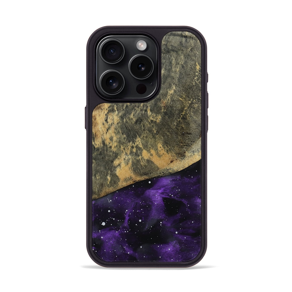 Myah has a unique mix of warm wood tones and dark, rich patterns. The contrast between the natural grain and the deep purple background creates a striking visual harmony.
