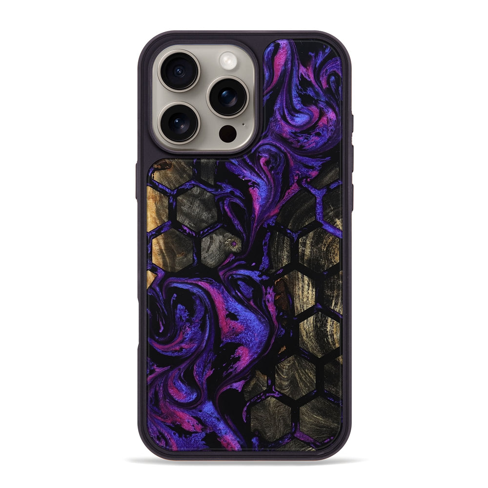 Aya has bold swirls of purple and pink flowing across a dark background. The striking hexagonal pattern adds a unique touch, blending natural wood texture with vibrant colors.