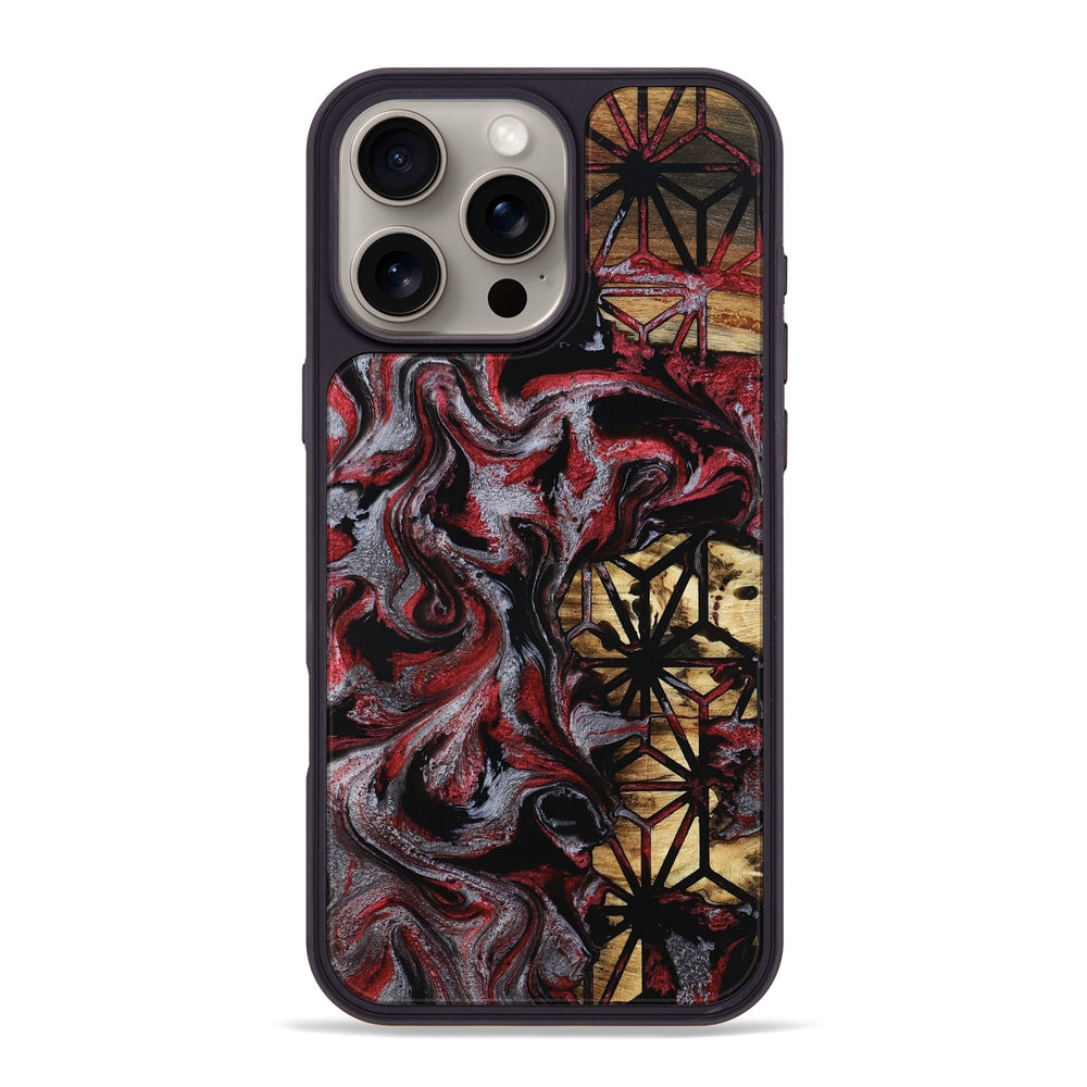 Coby is a vibrant piece of Buckeye wood with rich reds and blacks swirling together. It features a striking geometric pattern, creating a unique blend of natural beauty and design.