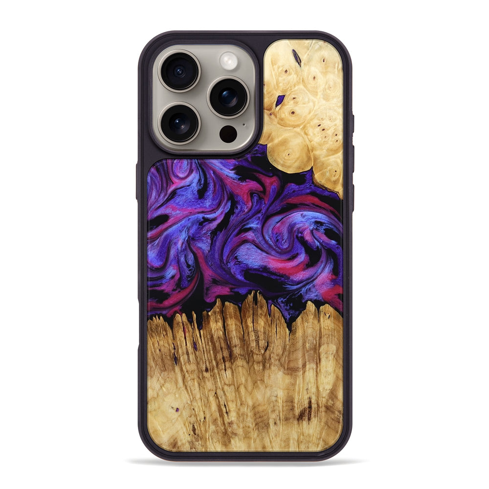 Jaelynn has rich, swirling patterns in deep purples and vibrant pinks, creating a lively contrast with the light, warm tones of the Buckeye wood. The smooth transitions and bold colors give it a dynamic and inviting appearance.