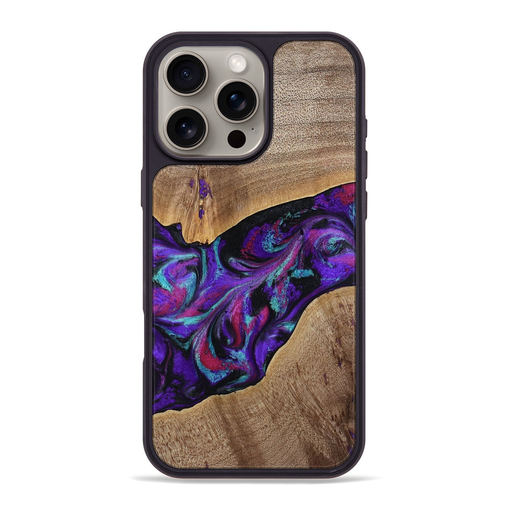 Jamila has beautiful swirls of deep purple and teal against a warm, golden maple background. The smooth grain of the wood enhances its natural charm and unique design.