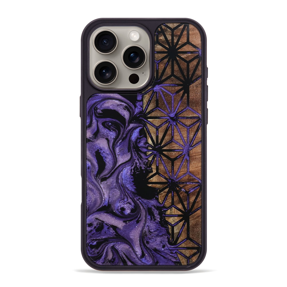 Matie has beautiful Maple wood with a warm, natural tone. The design features a flowing, purple swirl pattern next to a geometric arrangement, creating an interesting contrast.