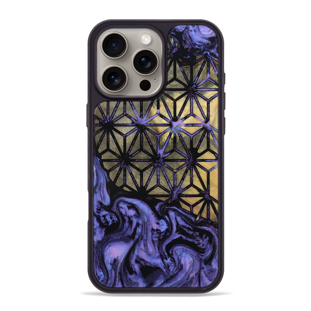Naya has a striking pattern of geometric shapes in a mix of deep purple and gold tones. The flowing lines create a sense of movement and depth across the wood.