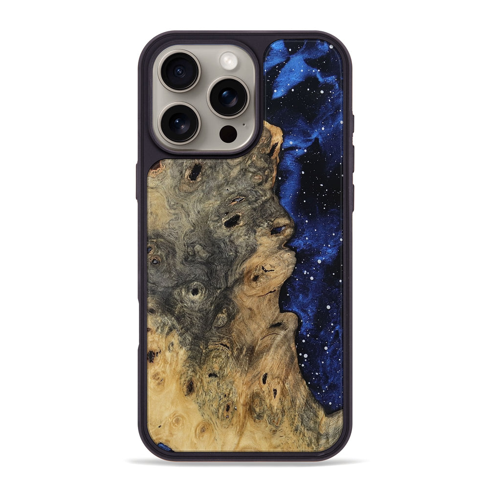 Neveah showcases the beautiful grain of Buckeye wood, with natural swirls and knots adding depth. Its warm tones contrast nicely with a vibrant blue background that hints at a cosmic pattern, creating a striking visual effect.