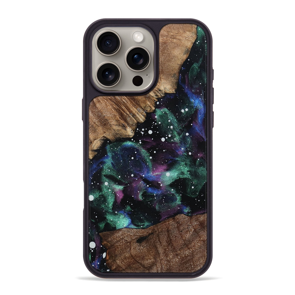 Phillip is a piece of Maple wood with rich, swirling patterns of deep greens and purples. It has a striking contrast between its smooth, natural surface and the vibrant, cosmic-like colors around it.